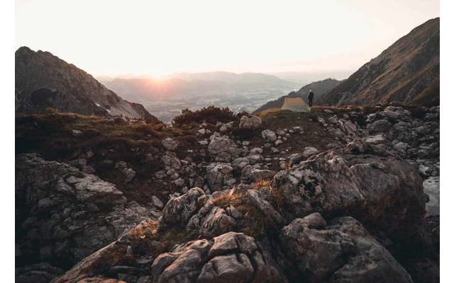La lona Traveller Tarp se suspende y se tensa desde los puntos de fijación de la estera (se incluyen clavijas y líneas con mosquetones ajustables). El corte trapezoidal de la lona permite que circule suficiente aire y sigue protegiendo de la lluvia, el sol y la caída de las hojas