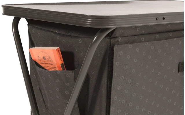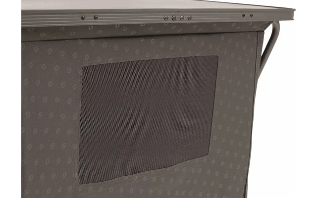 Mueble práctico y fácil de montar con un marco de aluminio que proporciona una excelente estabilidad. La robusta puerta abatible con asa ofrece un espacio de almacenamiento fácil de usar, como en casa. La puerta tiene una cerradura magnética. El armario contiene dos grandes compartimentos en los que se pueden guardar los utensilios. También hay un bolsillo organizador en el lateral para tener más espacio de almacenamiento. En los ganchos laterales se pueden fijar fácilmente varios bolsos o artículos similares.