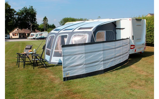 Viene con todo lo necesario para montar el cortavientos, incluyendo un canal de toldo para fijarlo a la caravana, clips para el cortavientos, pinchos de acero y tapones de acero.